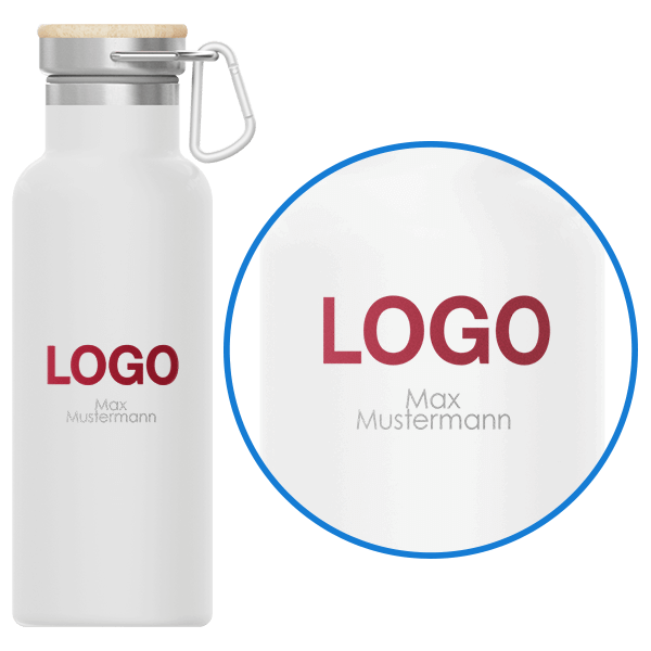Die doppelwandige Traveler-Edelstahlflasche verfügt über eine Vakuum-Isolierung, die dafür sorgt, dass die Temperatur Ihres Getränks lange erhalten bleibt. Wir können Ihr Logo im Siebdruck oder per Lasergravur auf die großzügige Werbefläche auf dem Körper der Wasserflasche drucken, und wir können Ihr Logo auch im Siebdruck auf den eleganten Bambusdeckel drucken. Die Traveler verfügt außerdem über einen praktischen Tragebügel, damit Sie sie überallhin mitnehmen können.